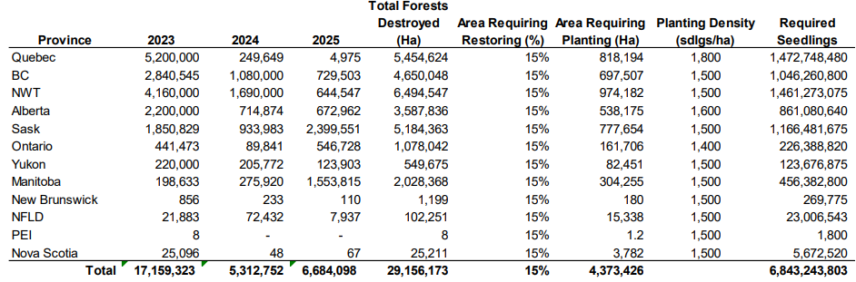 Seedlings Required to Restore Just 15% of Canada’s Forests Destroyed in 2023, 2024 & as of August 2025 Wildfires