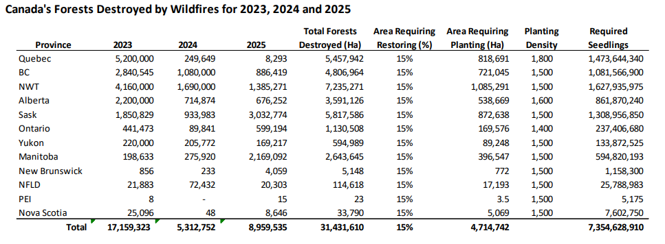 Seedlings Required to Restore Just 15% of Canada’s Forests Destroyed in 2023, 2024 & as of August 2025 Wildfires