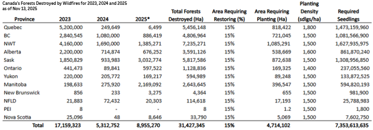 It was reported that more than 6.8 billion seedlings would be required to restore just 15% of forests lost to the 2023, 2024, and early 2025 wildfires. Since that release, updated burn-area figures now place the requirement closer to 7.3 billion seedlings as of November.